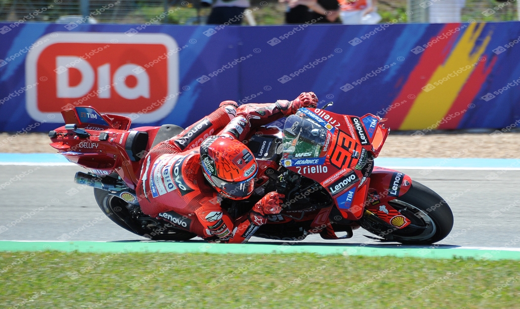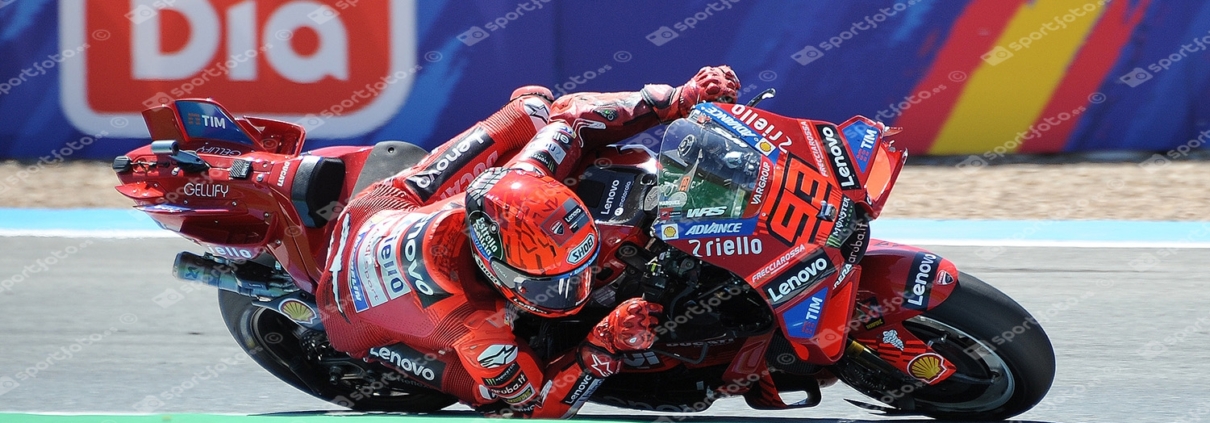 Marc Márquez traza espectacularmente una curva del trazado de Jerez durante la prueba de Moto GP disputada durante los días 26 y 27 de abril del 2025.