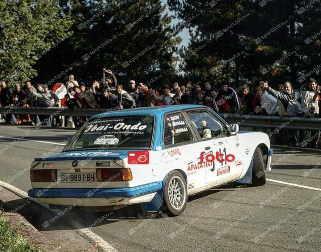 José Javier (Jospo) Aguinaga, copilotado por Andoni Urien, traza espectacularmente el cruce de Montecalvo, con su BMW 323 Alpina, durante el Rallye BBK Gernika-Lumo del año 2007.